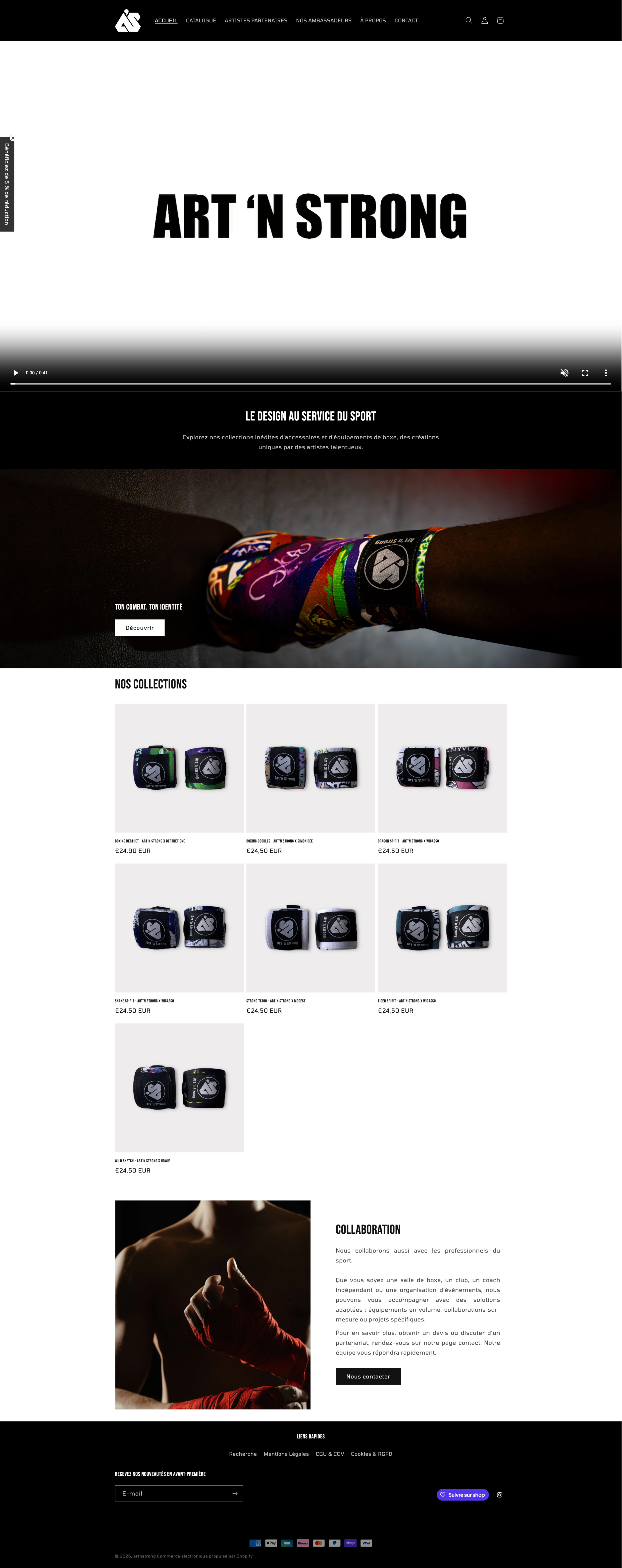 Art'n Strong est une marque qui place le sport de combat et le design au cœur de son identité. Elle propose des accessoires comme des bandes de boxe aux designs uniques et créatifs, nés de collaborations avec des artistes, pour allier style audacieux et performance sur le ring. Chaque création célèbre l’identité de ceux qui combattent, en offrant à la fois fonctionnalité, confort et caractère.